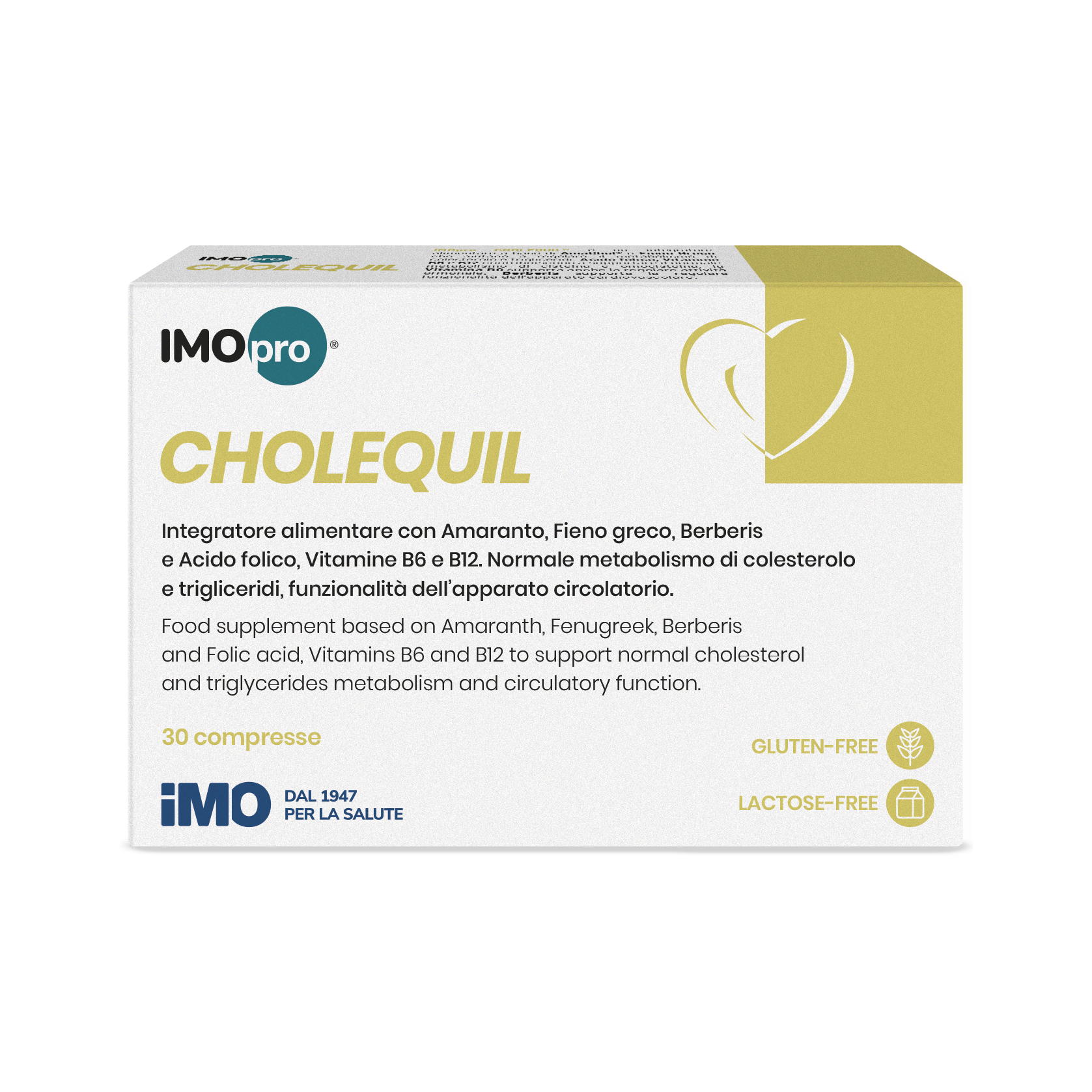 IMOpro CHOLEQUIL® è un integratore alimentare a base di Amaranto, Fieno greco, Berberina, Acido folico e vitamine B6 e B12 che contribuiscono al normale metabolismo di colesterolo e trigliceridi e al buon funzionamento del sistema circolatorio. È ben tollerato in quanto senza glutine, zuccheri aggiunti, edulcoranti, coloranti e naturalmente privo di lattosio. È ideale anche per chi segue un regime alimentare vegetariano o vegano.