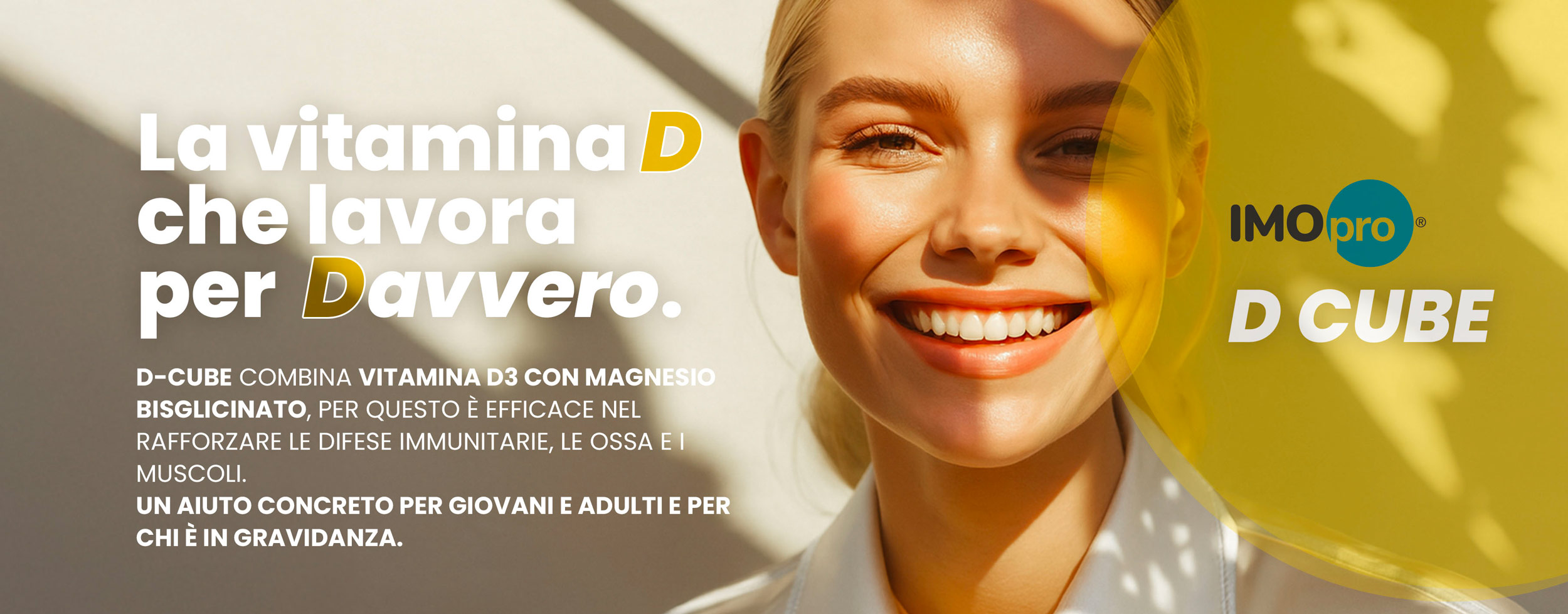 IMOpro®D CUBE è un integratore alimentare ad alto contenuto di Vitamina D3 che aiuta a mantenere la salute delle ossa e la regolare funzione muscolare contribuendo all’assorbimento e all’utilizzo di calcio e fosforo. Favorisce le naturali difese dell’organismo. È necessaria per la normale crescita e lo sviluppo delle ossa nei bambini.