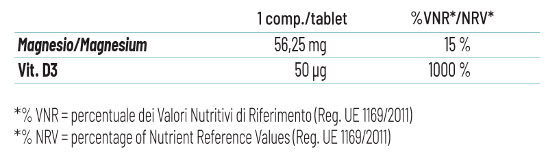 Magnesio Bisglicinato; Agenti di carica: Cellulosa microcristallina, Idrossi-propil-cellulosa; Vitamina D3 2000 UI (Colecalciferolo); Stabilizzante: Mono- e digliceridi degli acidi grassi; Agenti antiagglomeranti: Sali di magnesio degli acidi grassi, Biossido di silicio.